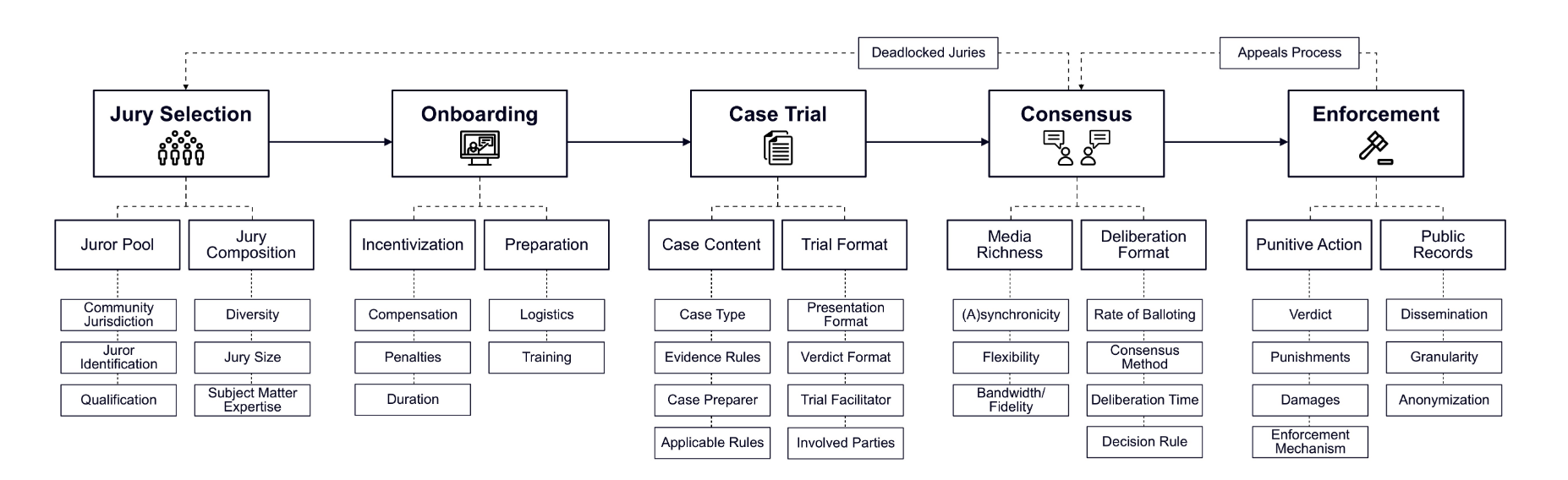 They are mainly focused on implementing digital juries. While they do not provide a definition they are operationalizing, they use a 5-stage model to define the jury process: jury selection, onboarding, case trial, consensus formation, and outcome enforcement.