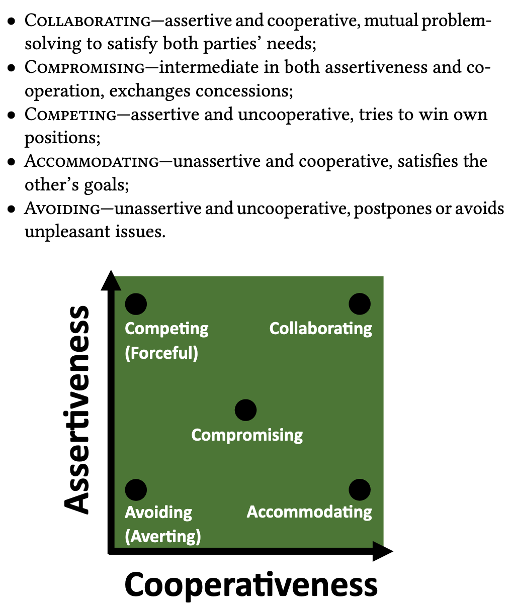 Five conflict resolution strategies emerge, mapped to the assertiveness-cooperativeness axes.