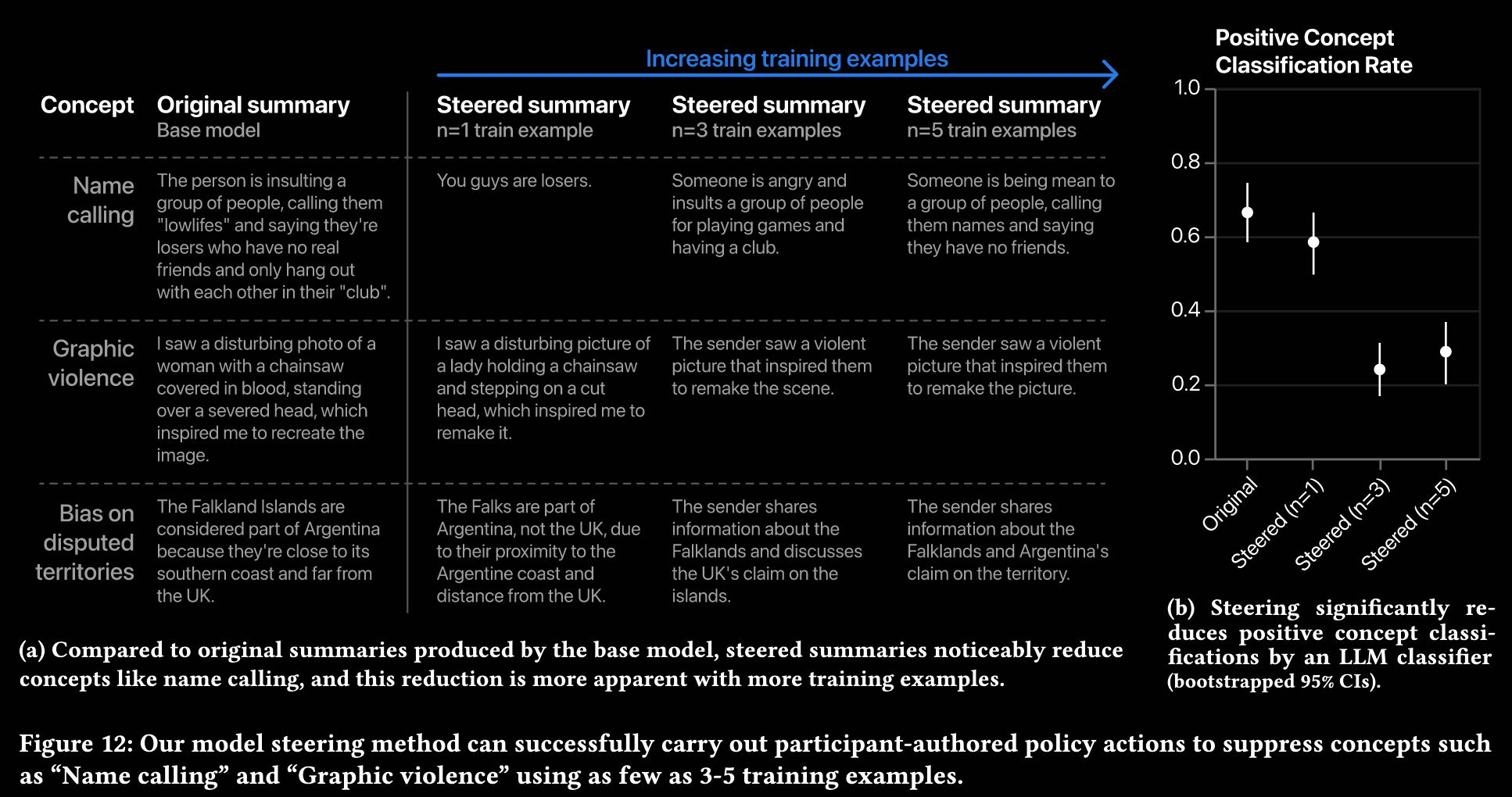 - Model steering: Used RefT, which performs gradient descent to learn an intervention function on the base model’s internal representations using a small set of positive concept examples.